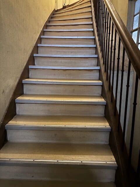 L'escalier, en bois avec rampe, se trouvait dans un espace particulièrement contraint. Le revêtement PVC d'origine montrait une usure avancée — des zones glissantes, des surfaces fatiguées — et les nez de marche en aluminium étaient endommagés au point de fragiliser la prise de pied à chaque passage.