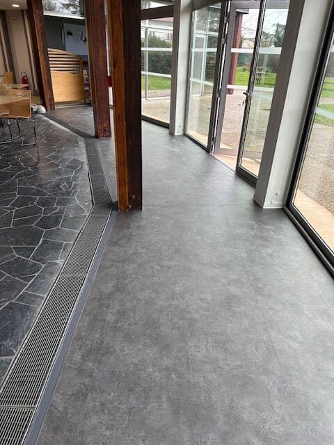 La demande du client était précise : remplacer le carrelage existant pour améliorer à la fois la sécurité, le confort d'usage et l'entretien au quotidien. Le contexte du site — une cantine en extension, zone industrielle, passage régulier — imposait une solution robuste, pas simplement esthétique. Un revêtement facile à nettoyer, résistant au trafic et sans risque de blessures liées à d'éventuels éclats.