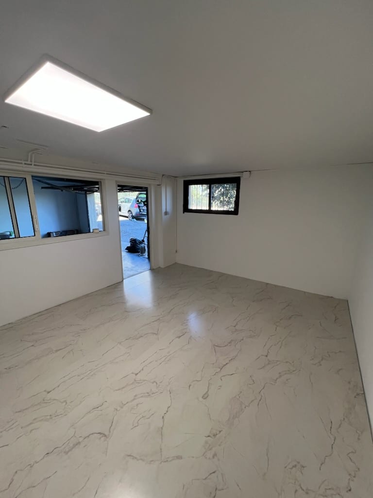 Au final, l’espace sort du chantier transformé : murs lisses et repeints en blanc, plafond rénové, revêtement PVC imitation marbre impeccablement posé, éclairage optimisé. Les finitions ne présentent ni traces ni irrégularités visibles, et les surfaces gagnent en facilité d’entretien au quotidien. Un environnement sobre, moderne et fonctionnel — exactement ce qui avait été demandé.