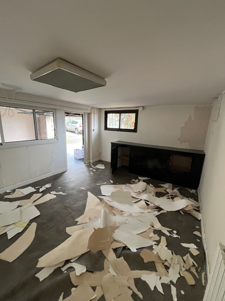 L’espace concerné — un local fermé avec fenêtres sur l’extérieur, un petit comptoir et une zone de rangement attenante — nécessitait une remise à neuf complète. Les murs présentaient une tapisserie ancienne partiellement décollée, un plâtre irrégulier et marqué par endroits. Au sol, l’ancien revêtement montrait des signes d’usure et de souillures. Des traces de dégradations venaient compléter le tableau.